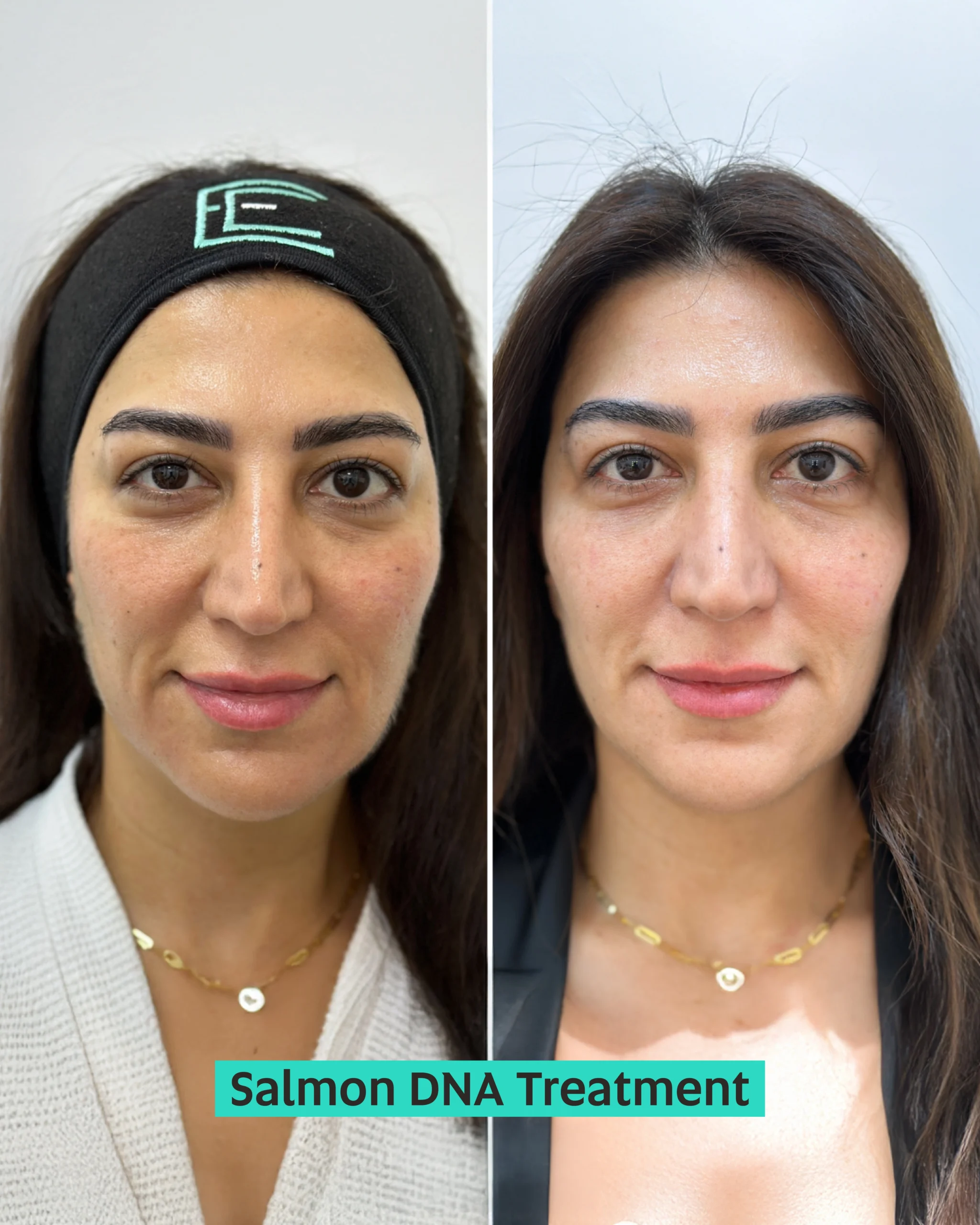 The delicate under-eye area responds exceptionally well to Salmon DNA treatment. This region often shows early signs of aging including dark circles, fine lines, hollowing, puffiness, and thin, crepey skin. Salmon DNA’s regenerative properties make it ideal for this sensitive area, improving skin quality and appearance without the risks associated with more aggressive treatments.